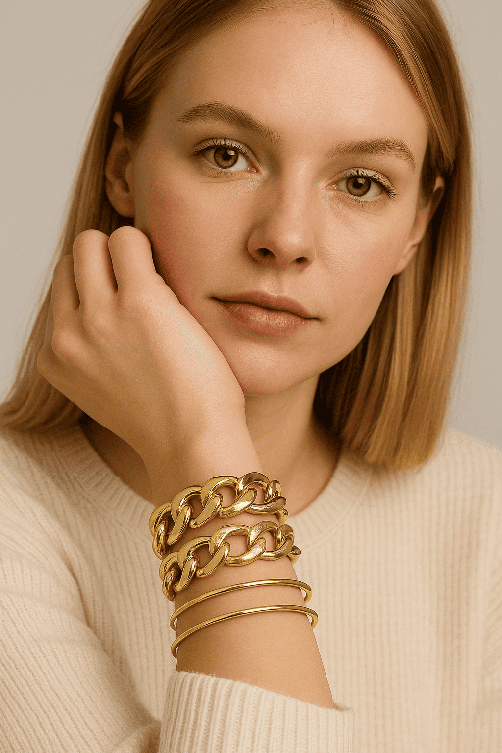 Deux bracelets à gros maillons façon chaîne gourmette apportent du caractère et du relief, tandis que les trois joncs fins et polis créent un contraste chic et raffiné. Parfait pour celles qui aiment les bijoux visibles et assumés sans renoncer à la sophistication.