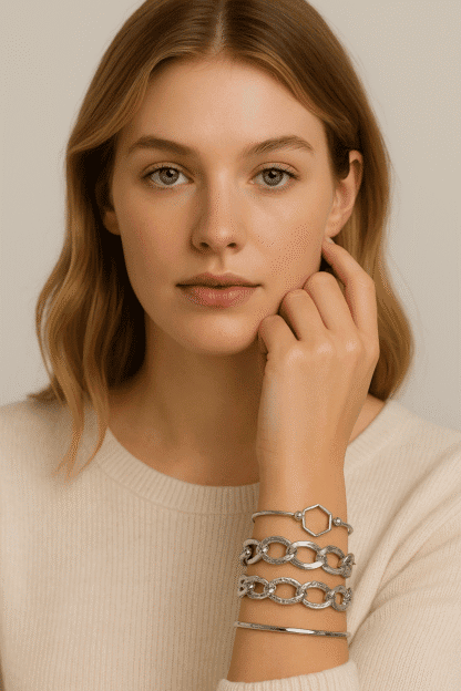 Les maillons larges effet martelé captent la lumière, pendant que le bracelet jonc à motif hexagonal apporte une touche géométrique ultra tendance. Ce mélange d’éléments rigides et texturés crée un jeu visuel dynamique, parfait pour rehausser une tenue neutre ou un look city chic.