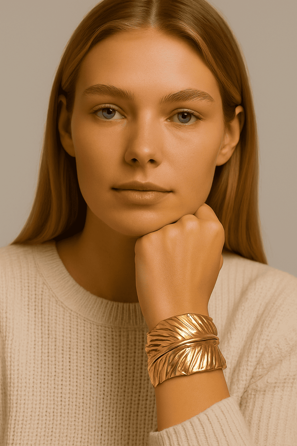 Avec ses reliefs organiques et sa texture façon feuille dorée, ce jonc large est une véritable pièce statement. Sculptural et lumineux, il habille instantanément le poignet avec une touche d’élégance naturelle. Son design inspiré de la nature évoque les nervures d’une feuille tropicale, pour un effet à la fois puissant et poétique.