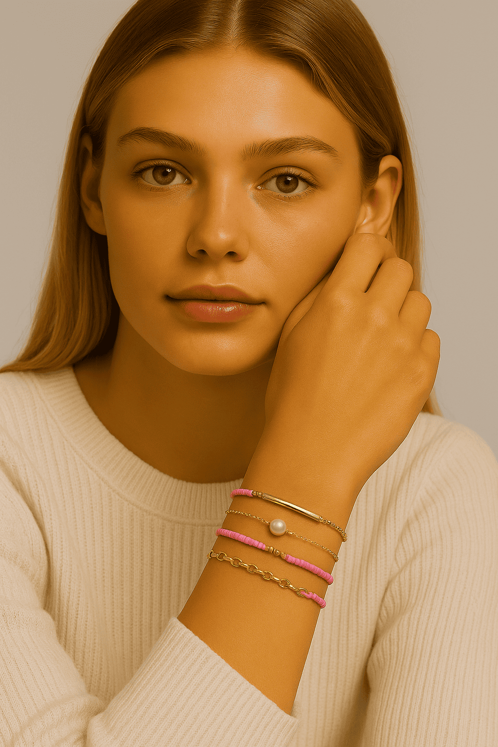 Set raffiné de 4 bracelets dorés avec perles roses vives et perle blanche naturelle. À porter seuls ou en accumulation pour un style féminin et lumineux. Taille ajustable, finition brillante.
