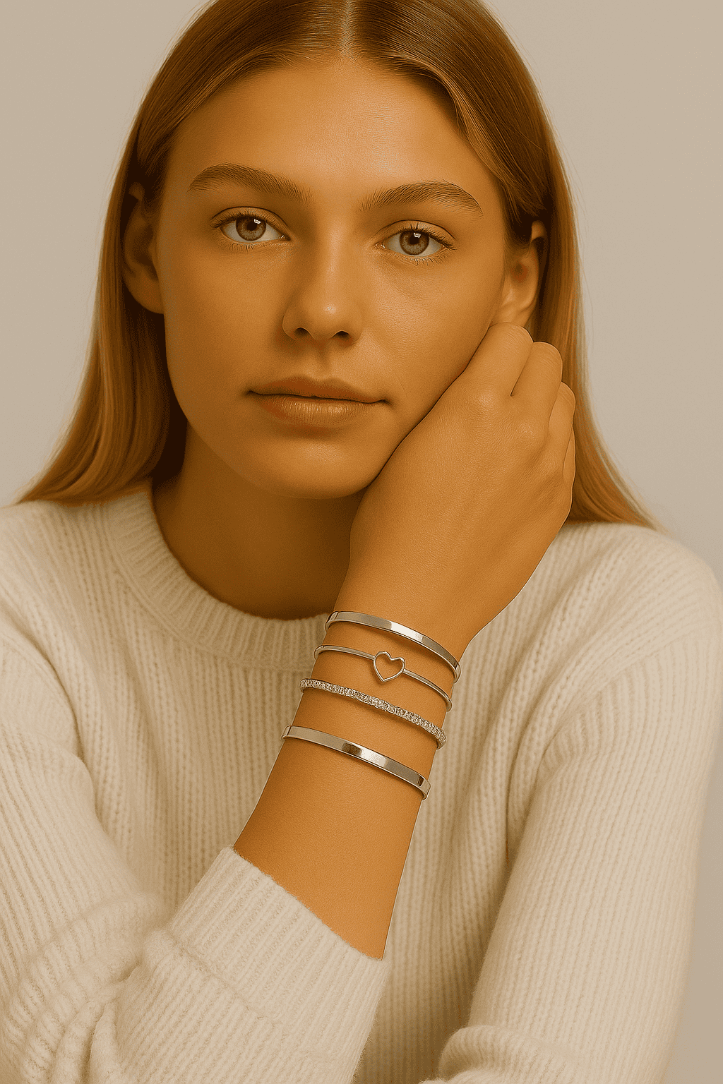 Féminin, délicat et lumineux – ce set de bracelets en métal argenté est un vrai coup de cœur pour celles qui aiment les bijoux fins à l’allure romantique. Il se compose de 4 joncs aux styles complémentaires : un bracelet orné d’un cœur ajouré, un modèle serti de strass scintillants et deux joncs brillants à l’effet miroir.