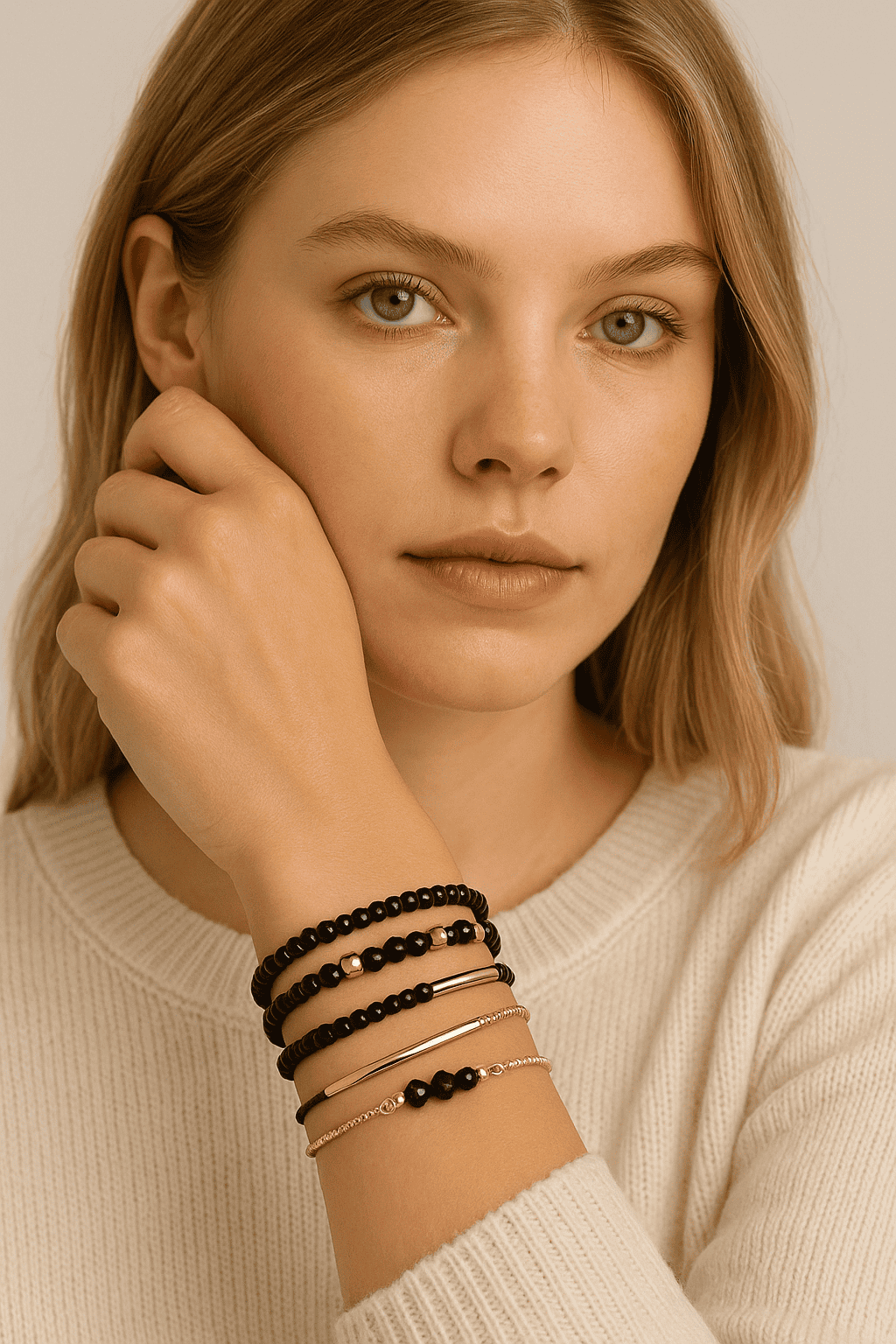 Ce set de bracelets noir et doré séduit par son élégance contrastée et son allure sophistiquée. Les perles noires mates s’accordent harmonieusement aux touches dorées lumineuses, créant un bijou à la fois moderne et intemporel.